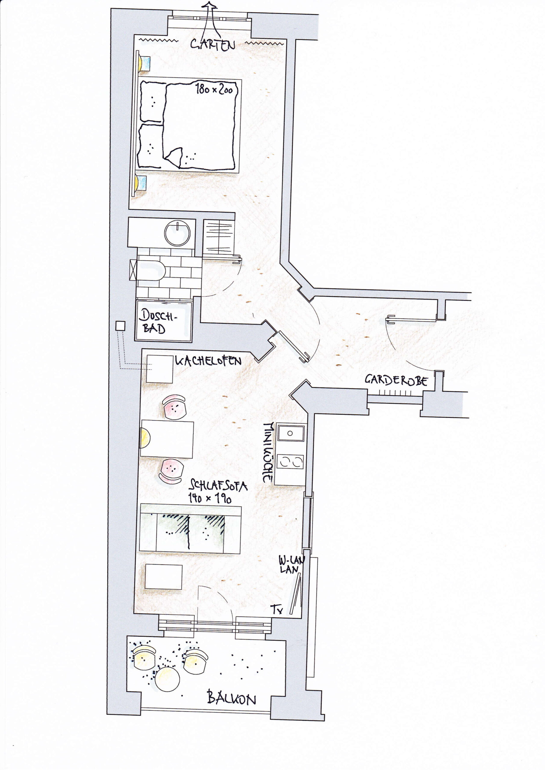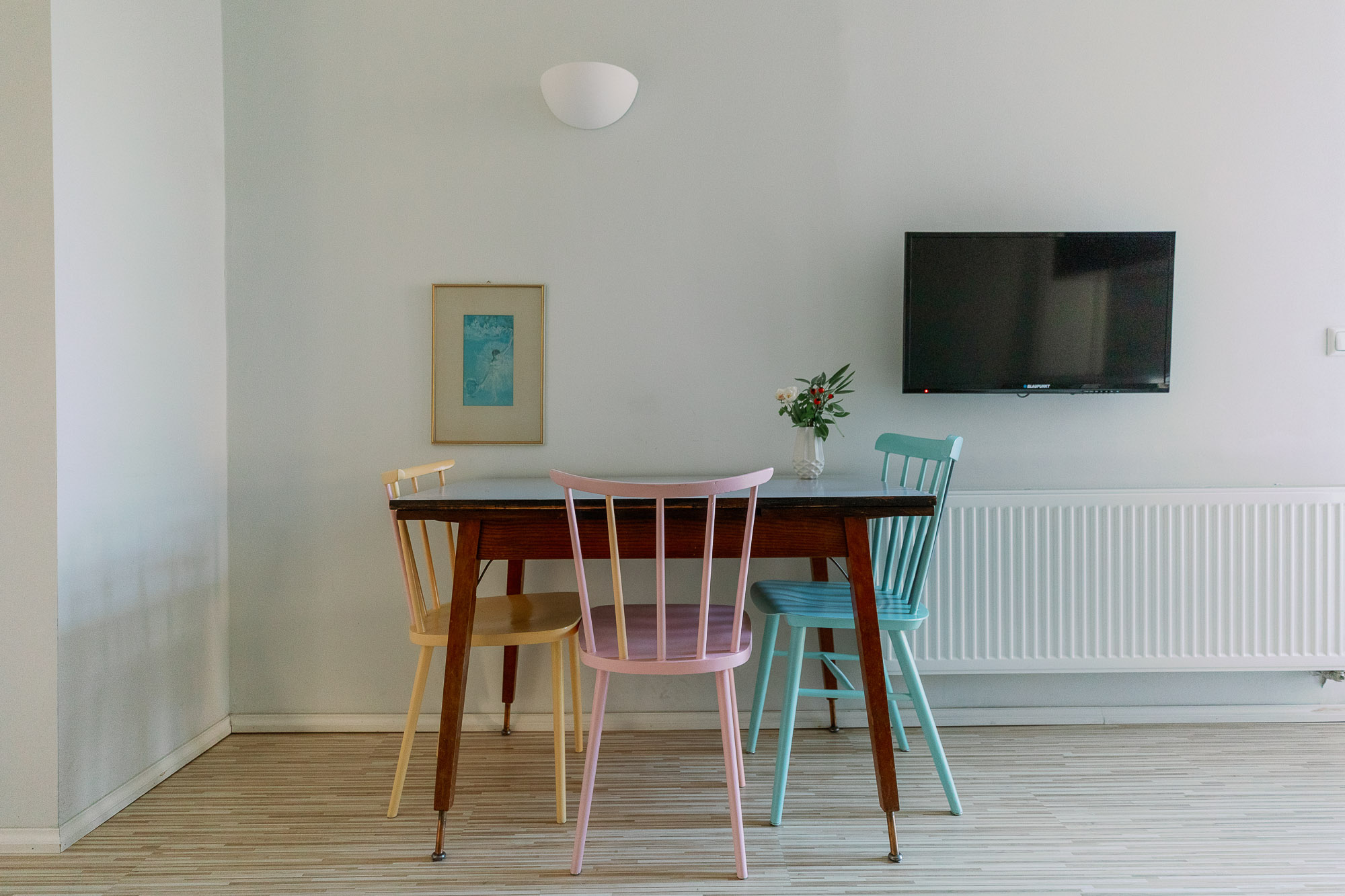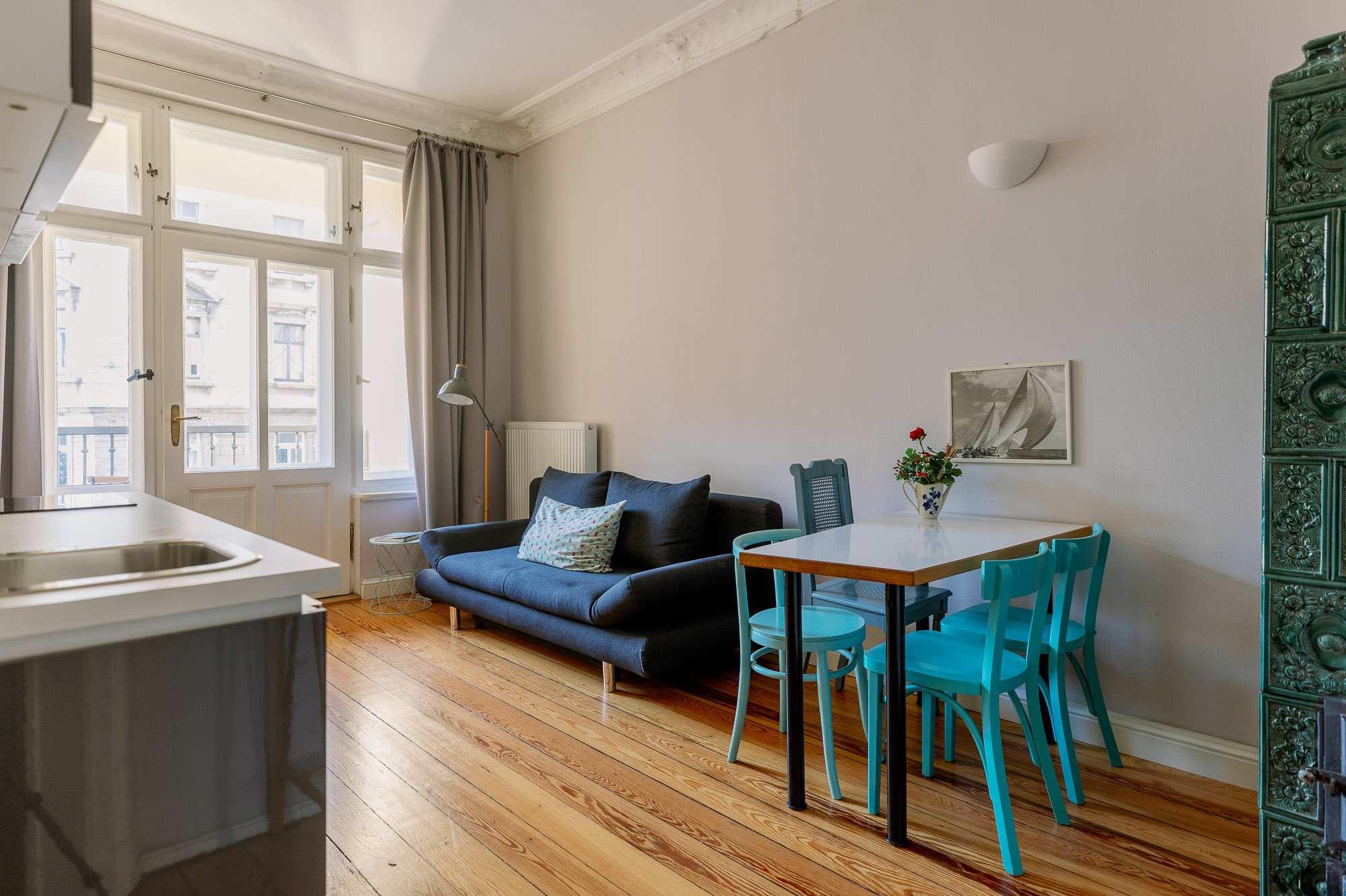 Appartement Blau combineert de sfeer van vervlogen tijden met het comfort van vandaag. De originele houten vloer, het gedetailleerde stucwerk, en de prachtige Art Nouveau tegelkachel geven dit appartement een authentieke uitstraling.